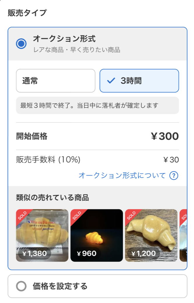 オークション形式を選択して出品する場合、「通常」オークションまたは「3時間限定」オークションのいずれかを選択できます。